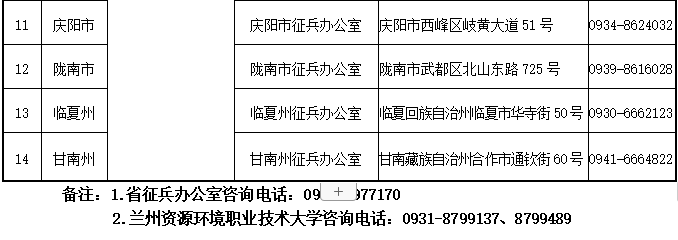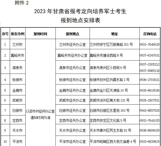 2.2023年甘肅省報考定向培養(yǎng)軍士考生報到地點安排表