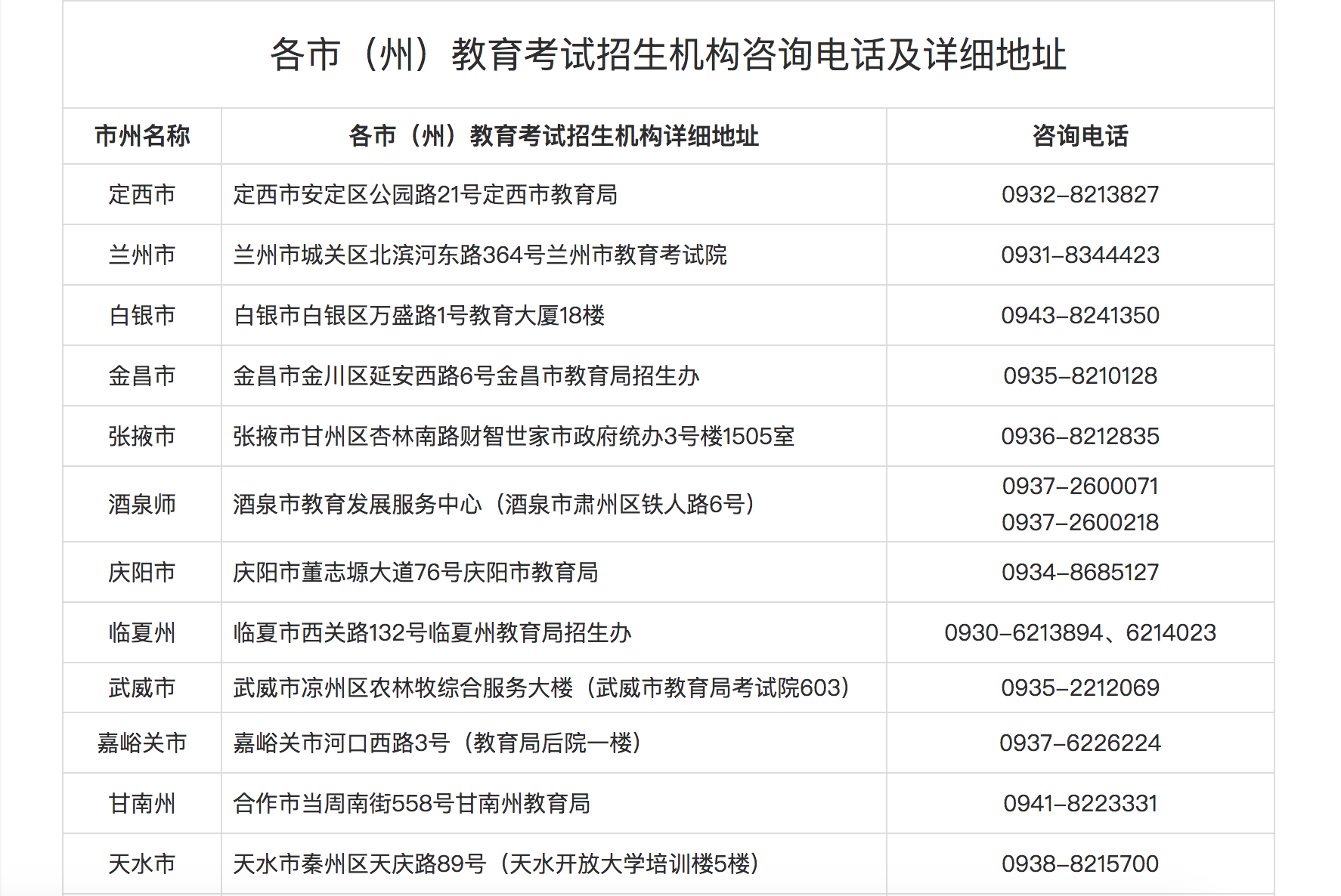 各市(州)教育考試招生機(jī)構(gòu)咨詢電話及詳細(xì)地址