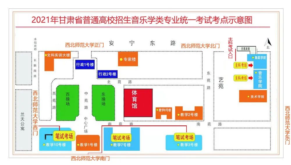 為做好新冠疫情疫情防控工作,確??忌樌雸?,考生須按照規(guī)定的出入口及路線出入相應(yīng)考點??忌鷳?yīng)提前在考點門口排隊,預(yù)留足夠時間配合考點工作人員進行入場核驗。具體路線見《2021年甘肅省普通高校招生音樂學(xué)類專業(yè)統(tǒng)一考試考點示意圖》。