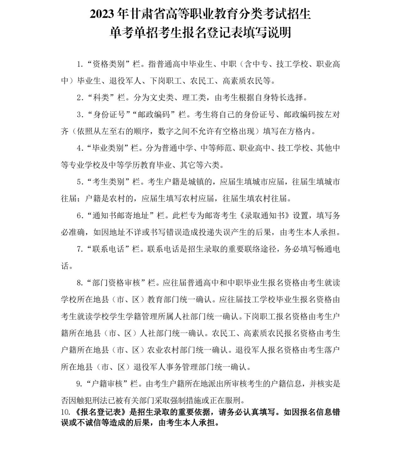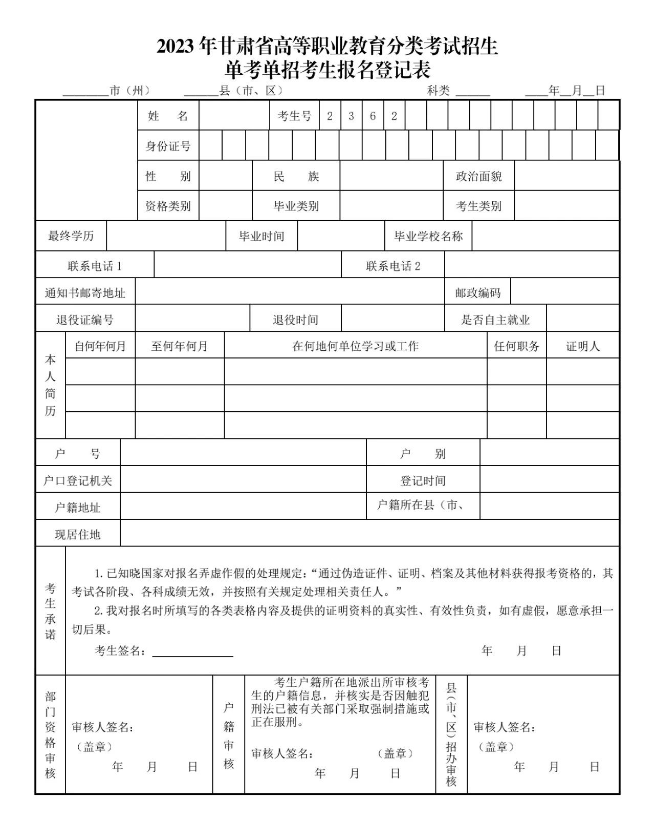 考生報(bào)名并提交后,打印《2023年甘肅省高等職業(yè)教育分類考試招生單考單招考生報(bào)名登記表》(見附件),一式三份。