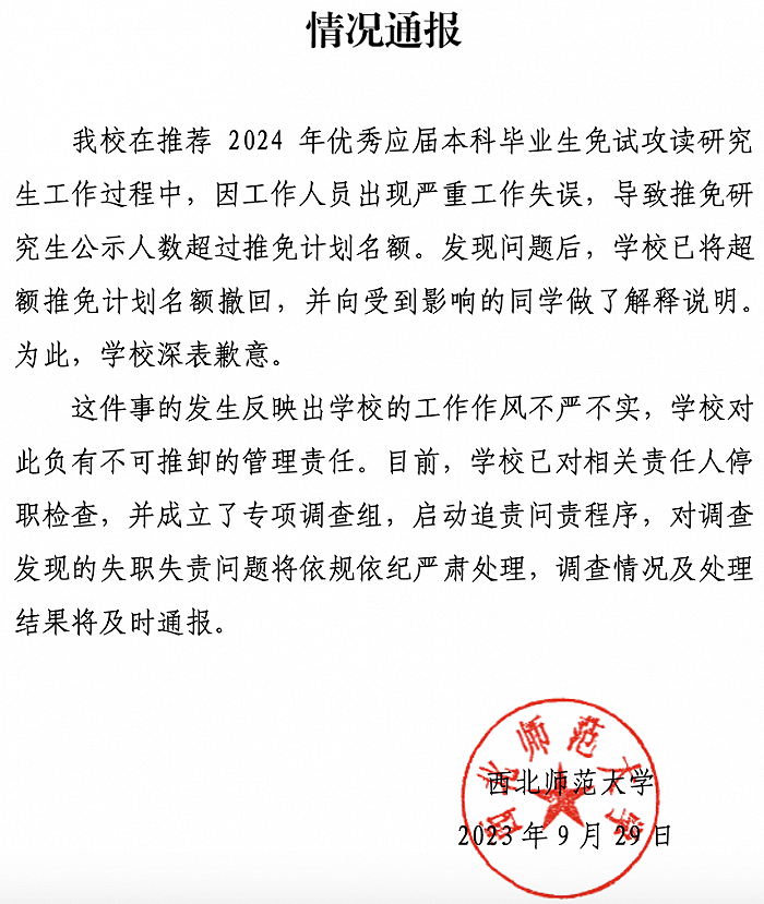 西北師范大學(xué)官網(wǎng)9月29日發(fā)布情況通報: