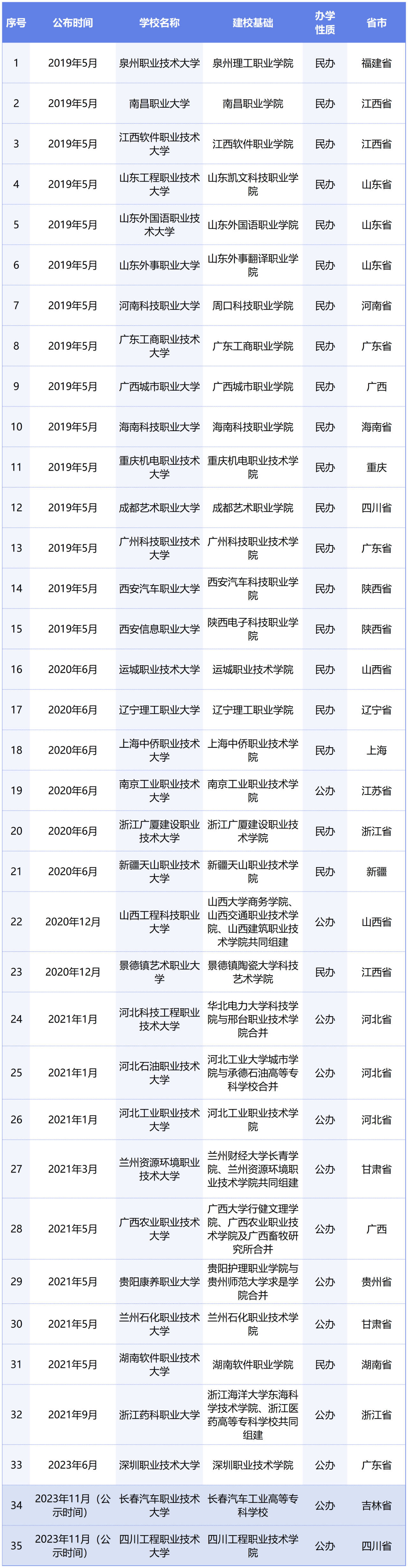 截至目前,經(jīng)教育部公布(公示)的職業(yè)本科院校累計35所(下表按照教育部公布/公示時間排序)。