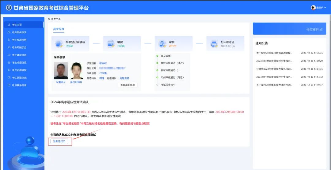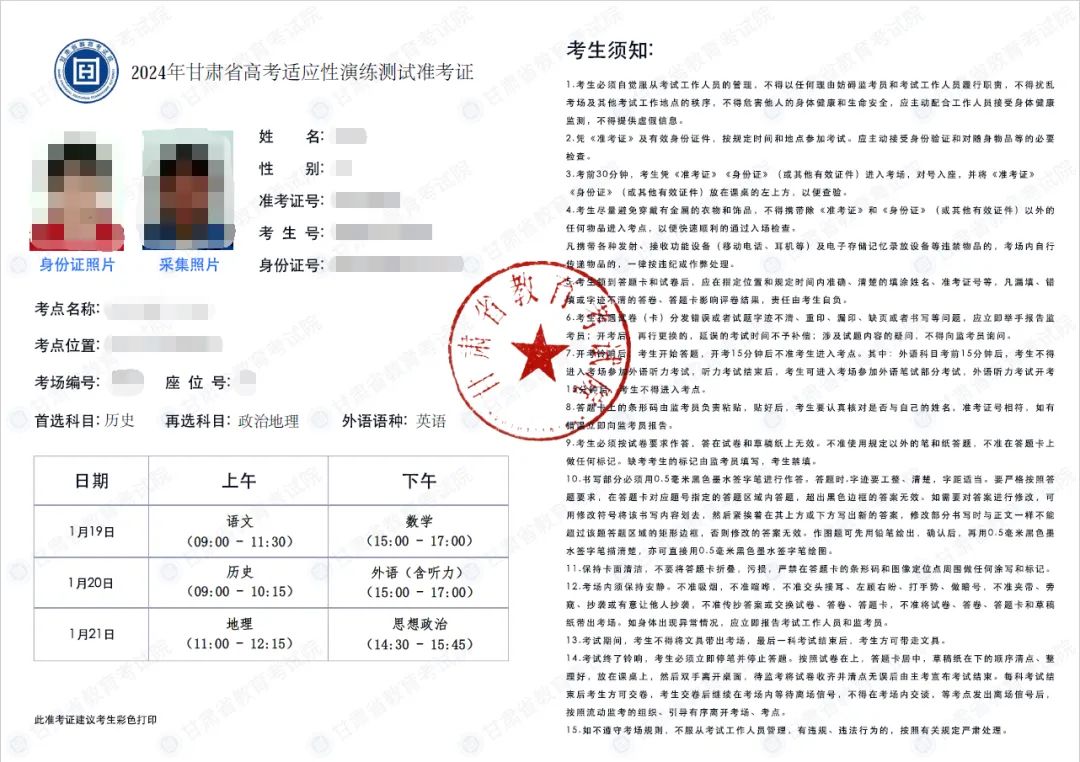 2024年甘肅省高考適應(yīng)性演練測試準(zhǔn)考證于1月14日開始打印。請所有參加本次適應(yīng)性演練測試的考生在考前登陸甘肅省國家教育考試綜合管理平臺考生服務(wù)平臺https://kw.ganseea.cn/login,點(diǎn)擊“準(zhǔn)考證打印”,即可下載準(zhǔn)考證。下載途徑以及準(zhǔn)考證示例如下: