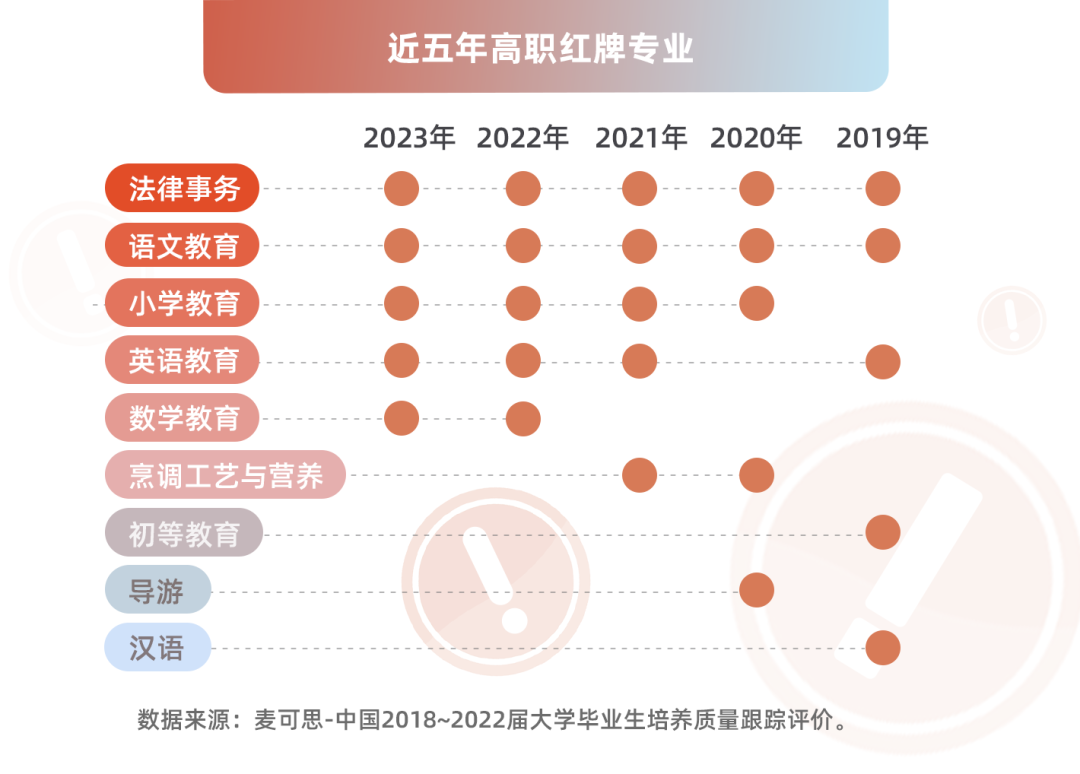高職近5年被列為高職紅牌專業(yè)次數(shù)最多的是法律事務(wù)、語文教育(均為5次),其后是小學(xué)教育、英語教育(4次)。