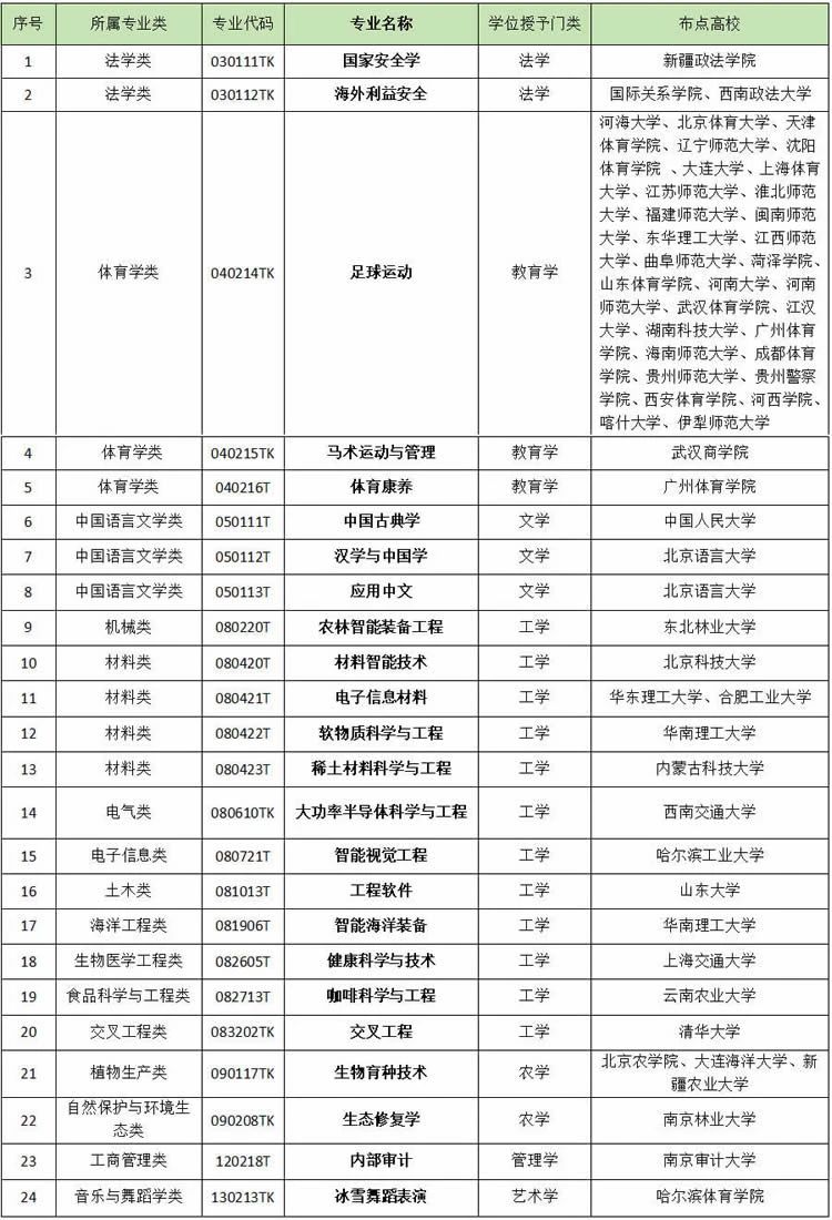 日前,教育部公布了2023年度普通高等學校本科專業(yè)備案和審批結(jié)果,并發(fā)布2024年普通高等學校本科專業(yè)目錄。其中,電子信息材料、軟物質(zhì)科學與工程、大功率半導體科學與工程、生物育種技術(shù)、生態(tài)修復學、健康科學與技術(shù)、智能視覺工程、足球運動、咖啡科學與工程等24種新專業(yè)(詳見表格)正式納入