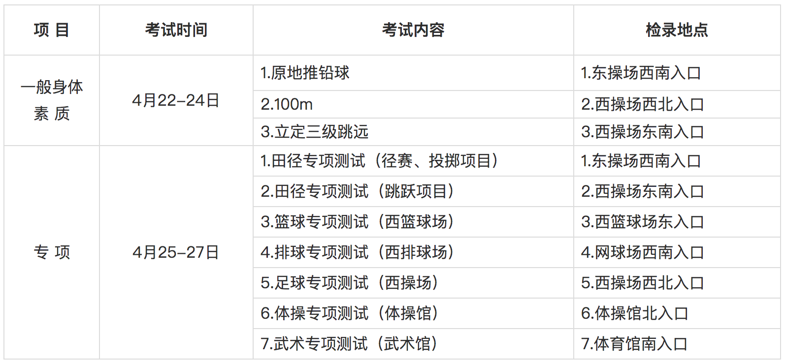 (四)測試采用分組輪換、集中測試的方式進行,4月22-24日為一般身體素質(zhì)測試,4月25-27日為專項測試,考生具體考試時間以《專業(yè)準考證》上公布為準。