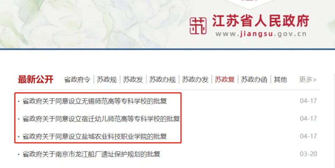 4月17日,江蘇省人民政府批復(fù)同意設(shè)立鹽城農(nóng)業(yè)科技職業(yè)學(xué)院、宿遷幼兒師范高等專科學(xué)校、無錫師范高等??茖W(xué)校。