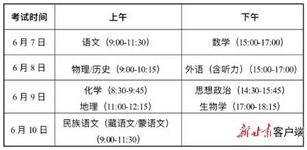 考試具體時(shí)間安排為:6月7日上午考語(yǔ)文,下午考數(shù)學(xué);6月8日上午考物理/歷史,下午考外語(yǔ)(含聽(tīng)力);6月9日上午考化學(xué)和地理,下午考思想政治和生物學(xué);6月10日上午考民族語(yǔ)文(藏語(yǔ)文、蒙語(yǔ)文)。