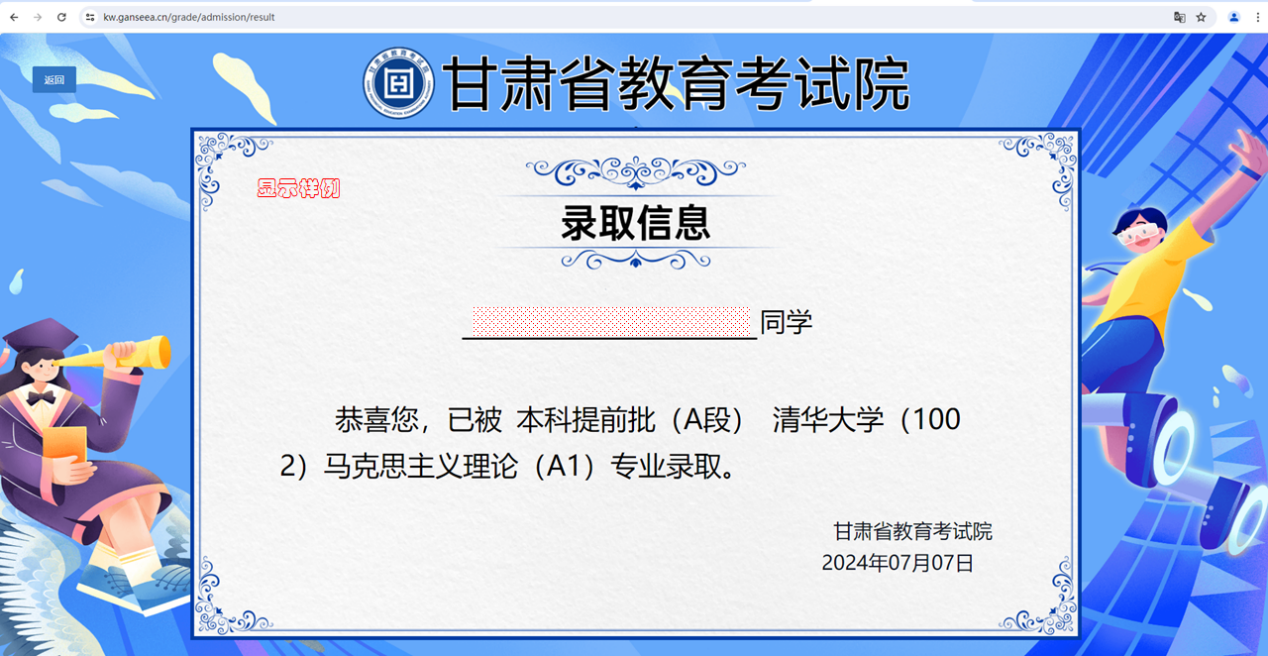 訪問(wèn)甘肅省教育考試院官網(wǎng):https://www.ganseea.cn,點(diǎn)擊“信息查詢”模塊進(jìn)入查詢頁(yè)面或直接輸入網(wǎng)址https://kw.ganseea.cn/grade/admission進(jìn)行查詢,或點(diǎn)擊“綜合管理平臺(tái)”模塊,訪問(wèn)“考生入口”并登錄后進(jìn)行查詢。
