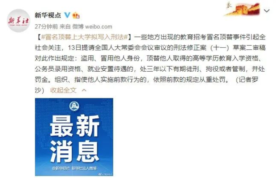 冒名頂替上大學擬寫入刑法
