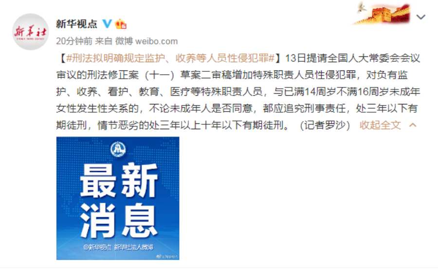 13日提請全國人大常委會會議審議的刑法修正案(十一)草案二審稿增加特殊職責人員性侵犯罪,對負有監(jiān)護、收養(yǎng)、看護、教育、醫(yī)療等特殊職責人員,與已滿14周歲不滿16周歲未成年女性發(fā)生性關系的,不論未成年人是否同意,都應追究刑事責任,處三年以下有期徒刑,情節(jié)惡劣的處三年以上十年以下有期徒刑。