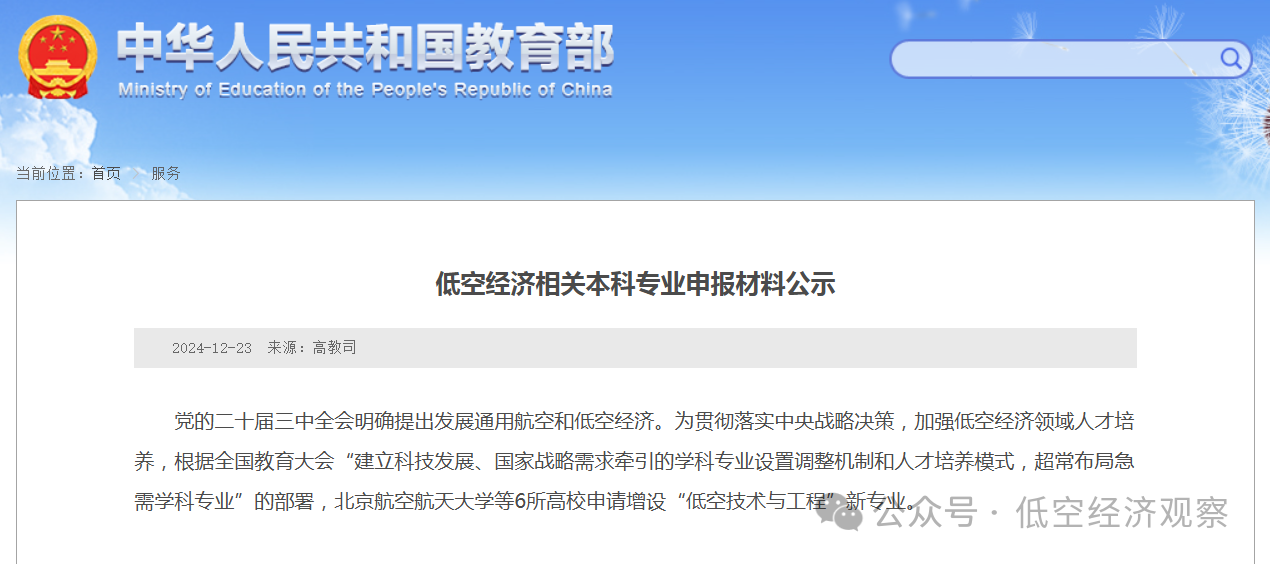 6所高校申請?jiān)鲈O(shè)低空經(jīng)濟(jì)相關(guān)本科專業(yè),教育部增設(shè)電動飛行器應(yīng)用技術(shù)等職業(yè)教育專業(yè)