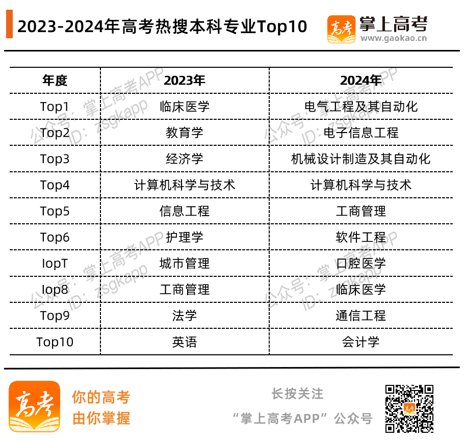 從2023-2024年高考熱搜本科專業(yè)Top10來看,電氣工程及其自動化打敗了臨床醫(yī)學(xué)專業(yè),成了2024年的專業(yè)熱搜王者??梢哉f,考生和家長對于專業(yè)的偏好每年都在變。