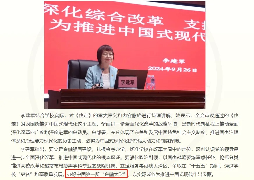 此前,2024年9月26日,廣東金融學(xué)院召開黨委理論學(xué)習(xí)中心組學(xué)習(xí)(擴(kuò)大)會(huì)議,黨委書記李建軍在題為“深化綜合改革 支持全面創(chuàng)新 為推進(jìn)中國(guó)式現(xiàn)代化作貢獻(xiàn)”的主題報(bào)告中指出,要立足金融強(qiáng)國(guó)建設(shè),扎根金融辦學(xué),找準(zhǔn)學(xué)校在改革大局中的定位。爭(zhēng)取在“十五五”期間,通過學(xué)?!案焙透哔|(zhì)量發(fā)展,辦好中國(guó)第一所“金融大學(xué)”,以實(shí)際成效為推進(jìn)中國(guó)式現(xiàn)代作出貢獻(xiàn)。