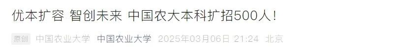 據(jù)中國(guó)農(nóng)業(yè)大學(xué)微信公眾號(hào)消息,2025年,適逢中國(guó)農(nóng)業(yè)大學(xué)建校120周年之際,為響應(yīng)國(guó)家重大戰(zhàn)略需求,推進(jìn)拔尖創(chuàng)新人才自主培養(yǎng)。學(xué)校將扎實(shí)推進(jìn)優(yōu)質(zhì)本科擴(kuò)容,增加500名本科招生名額,重點(diǎn)面向國(guó)家急需的前沿技術(shù)和新興業(yè)態(tài),緊緊圍繞糧食安全、生物智造、人工智能與裝備制造、綠色能源與可持續(xù)發(fā)展、食品安全與人類健康等學(xué)科領(lǐng)域擴(kuò)大招生規(guī)模,同時(shí)計(jì)劃開設(shè)院士班、卓越工程師班等人才培養(yǎng)班型。