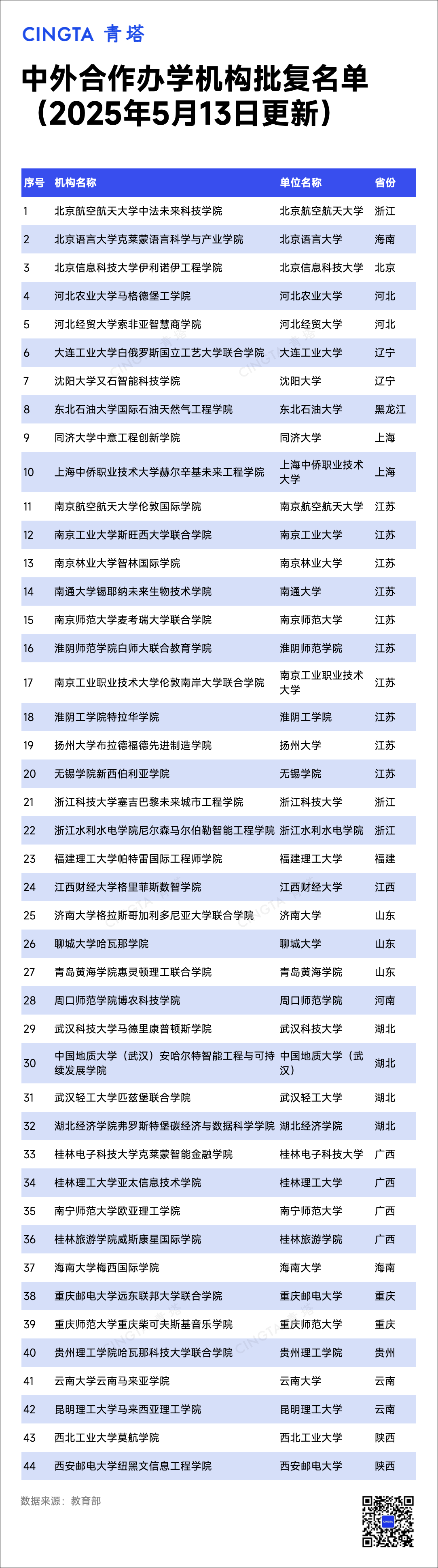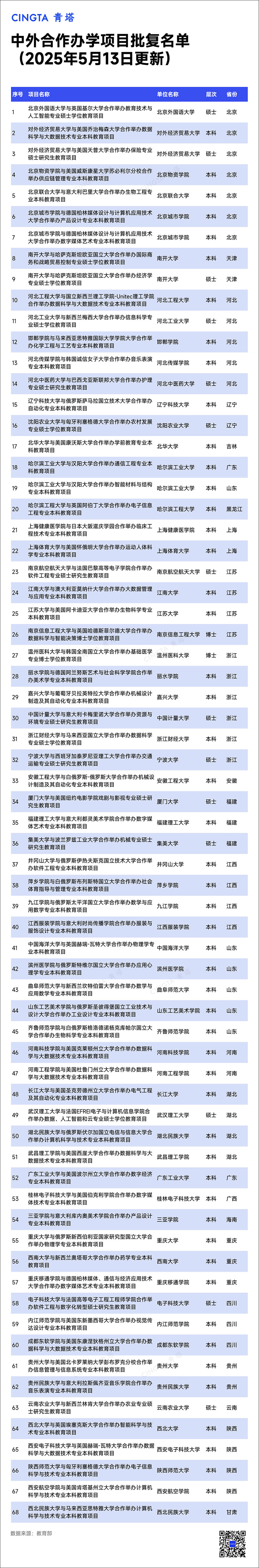 5月13日,教育部中外合作辦學(xué)監(jiān)管工作信息平臺公布了教育部予以資格認(rèn)定的中外合作辦學(xué)單位。據(jù)統(tǒng)計(jì),此次共有105所高校獲批,其中,