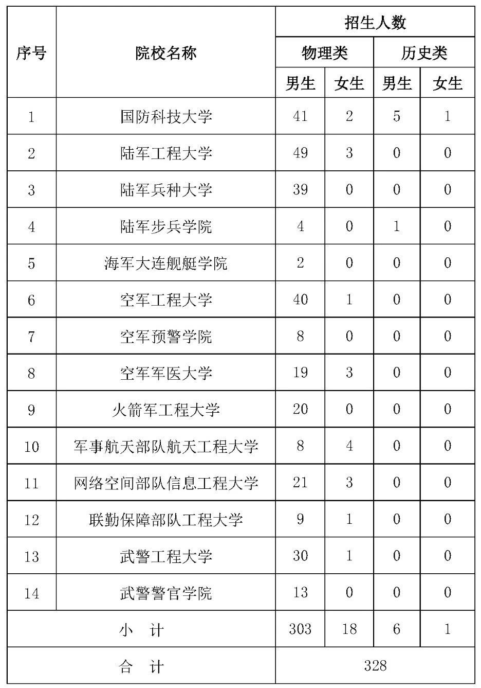今年共有14所軍隊院校在我省招收普通高中畢業(yè)生328名,其中物理類男生303人、女生18人,歷史類男生6人、女生1人。各院校及分校的簡介,考生可登錄學(xué)校招生網(wǎng)站或“軍校招生”微信公眾號查詢。具體招生計劃詳見附件。