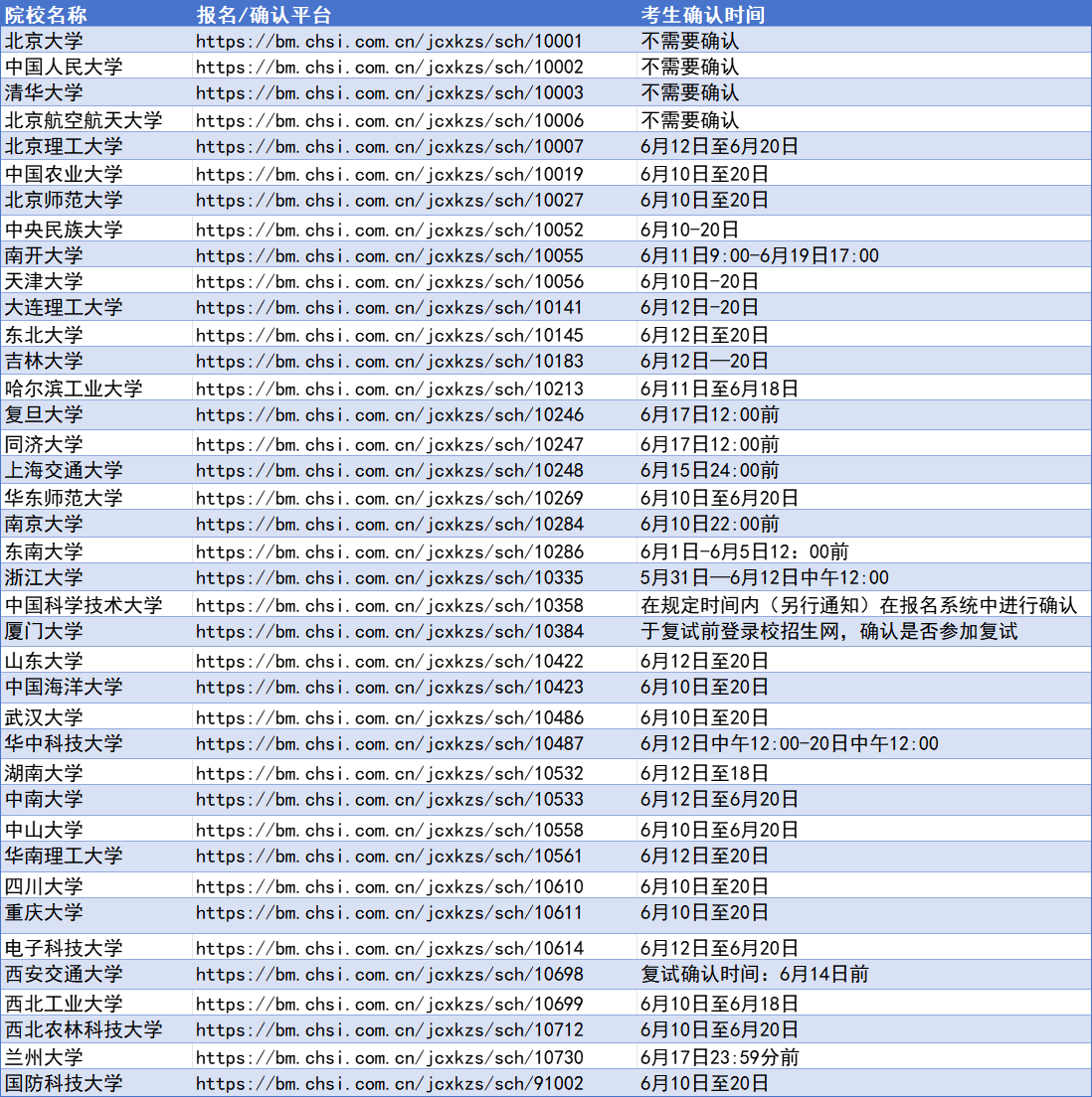39所試點高校確認網址及考生確認時間