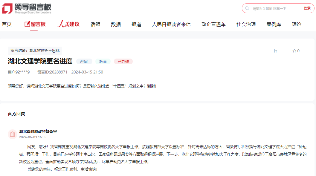 2024年3月,有網(wǎng)友通過人民網(wǎng)領(lǐng)導(dǎo)留言板咨詢“湖北文理學(xué)院更名大學(xué)的進(jìn)展”,湖北省政府政務(wù)督查室回復(fù)表示:“目前已在學(xué)校碩士生占比、國家級科研成果獎(jiǎng)等方面取得積極進(jìn)展。下一步,湖北文理學(xué)院將繼續(xù)加大工作力度,以加快建成位于襄陽市襄城區(qū)尹集鄉(xiāng)的新校區(qū)為重點(diǎn),全面推動(dòng)實(shí)現(xiàn)各項(xiàng)辦學(xué)指標(biāo)達(dá)標(biāo),盡早啟動(dòng)更名大學(xué)申報(bào)工作。”