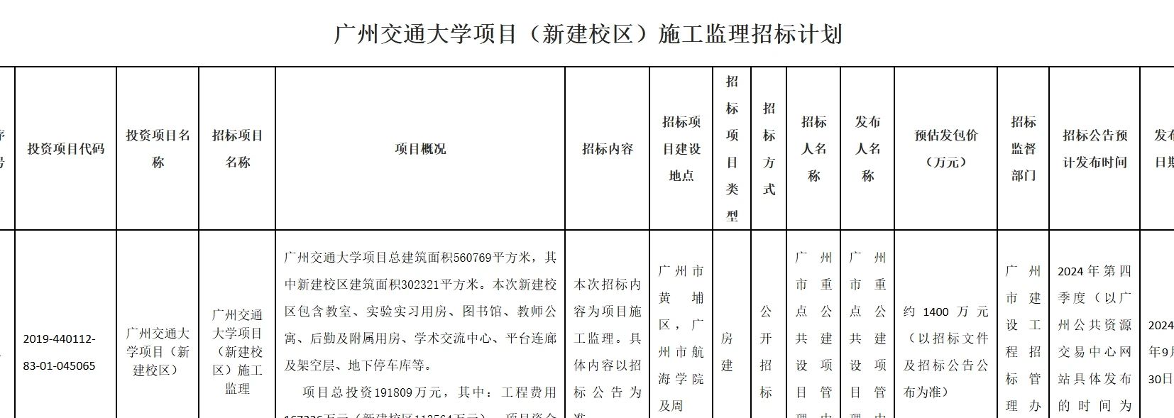 據(jù)招標(biāo)計(jì)劃顯示,廣州交通大學(xué)項(xiàng)目總建筑面積560769平方米,其中新建校區(qū)建筑面積302321平方米。項(xiàng)目總投資191809萬元,其中:工程費(fèi)用167226萬元(新建校區(qū)113564萬元)。項(xiàng)目資金來源為市本級基本建設(shè)統(tǒng)籌資金。