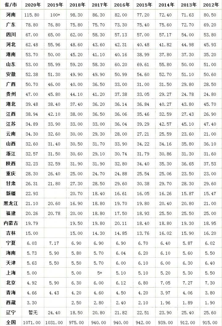 中西部地區(qū),是對(duì)我國(guó)中部地區(qū)和西部地區(qū)的總稱,其主要包括河北、山西、內(nèi)蒙古、吉林、黑龍江、安徽、江西、河南、湖北、湖南、廣西、海南、重慶、四川、貴州、云南、西藏、陜西、甘肅、青海、寧夏、新疆22個(gè)?。▍^(qū)、市)。【2020年至2012年各省高考人數(shù)統(tǒng)計(jì)表】這張統(tǒng)計(jì)表中,統(tǒng)計(jì)了全國(guó)31個(gè)省市的考生人數(shù),2020年高考人數(shù)在40萬(wàn)以上的省份,共有9個(gè)省份,分別是:河南、廣東、四川、河北、湖南、山東、安徽、廣西和貴州。我們看到,既是“中西部地區(qū)省份”,又是“考生大省”的,多達(dá)7個(gè),它們分別是河南、四川、河北、湖南、安徽、廣西、貴州。我相信,這幾個(gè)省的名字在每年的高考季,總有那么幾個(gè)你會(huì)聽(tīng)到。它們的情況要么考生人數(shù)眾多,要么經(jīng)濟(jì)發(fā)展水平落后,要么省內(nèi)優(yōu)質(zhì)高校資源稀缺。