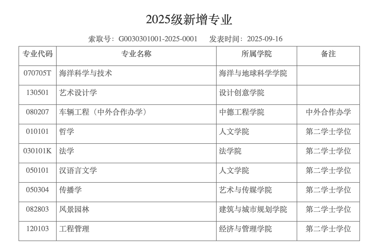學校2025級新增專業(yè)為:海洋科學與技術、藝術設計學、車輛工程(中外合作辦學)、哲學(第二學士學位)、法學
