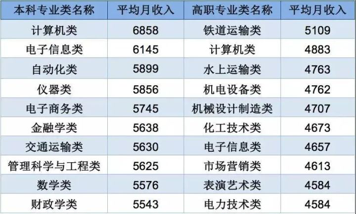 2019屆畢業(yè)生月收入前十的專業(yè)類