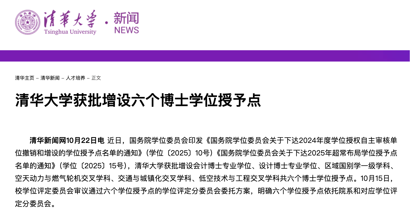 據(jù)清華大學(xué)新聞網(wǎng)消息,近日,國(guó)務(wù)院學(xué)位委員會(huì)印發(fā)《國(guó)務(wù)院學(xué)位委員會(huì)關(guān)于下達(dá)2024年度學(xué)位授權(quán)自主審核單位撤銷(xiāo)和增設(shè)的學(xué)位授予點(diǎn)名單的通知》(學(xué)位〔2025〕10號(hào))《國(guó)務(wù)院學(xué)位委員會(huì)關(guān)于下達(dá)2025年超常布局學(xué)位授予點(diǎn)名單的通知》(學(xué)位〔2025〕15號(hào)),清華大學(xué)獲批增設(shè)會(huì)計(jì)博士專(zhuān)業(yè)學(xué)位、設(shè)計(jì)博士專(zhuān)業(yè)學(xué)位、區(qū)域國(guó)別學(xué)一級(jí)學(xué)科、空天動(dòng)力與燃?xì)廨啓C(jī)交叉學(xué)科、交通與城鎮(zhèn)化交叉學(xué)科、低空技術(shù)與工程