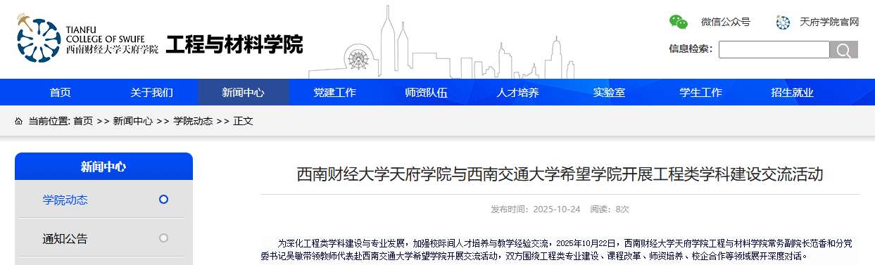 10月22日,西南財經(jīng)大學天府學院工程與材料學院赴西南交通大學希望學院開展交流活動,以深化工程類學科建設與專業(yè)發(fā)展。西南財經(jīng)大學天府學院在介紹其發(fā)展規(guī)劃時提到:學科布局上,將工程與材料學科劃分為4個系,設置9個專業(yè),停招建筑學等適配度較低專業(yè),工造專業(yè)目前正在進行專業(yè)認證準備工作;人才培養(yǎng)模式獨具特色,推行“大班+中班+小班”分層教學,以任務包為載體培養(yǎng)多能力融合人才。