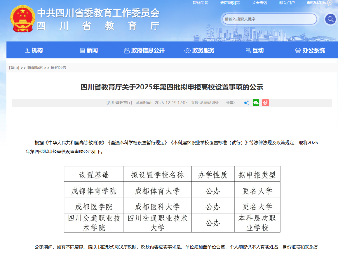 12月19日,四川省教育廳發(fā)布《關于2025年第四批擬申報高校設置事項的公示》。