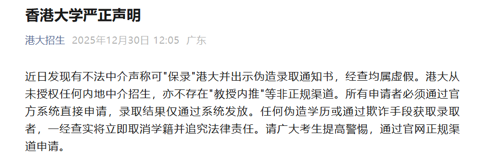 近日發(fā)現(xiàn)有不法中介聲稱可“保錄”港大并出示錄取通知書,經(jīng)查均屬偽造。港大從未授權(quán)任何內(nèi)地中介招生,也不存在“教授內(nèi)推”等非正規(guī)渠道。所有申請(qǐng)者必須通過官方系統(tǒng)直接申請(qǐng),錄取結(jié)果僅通過系統(tǒng)發(fā)放。
