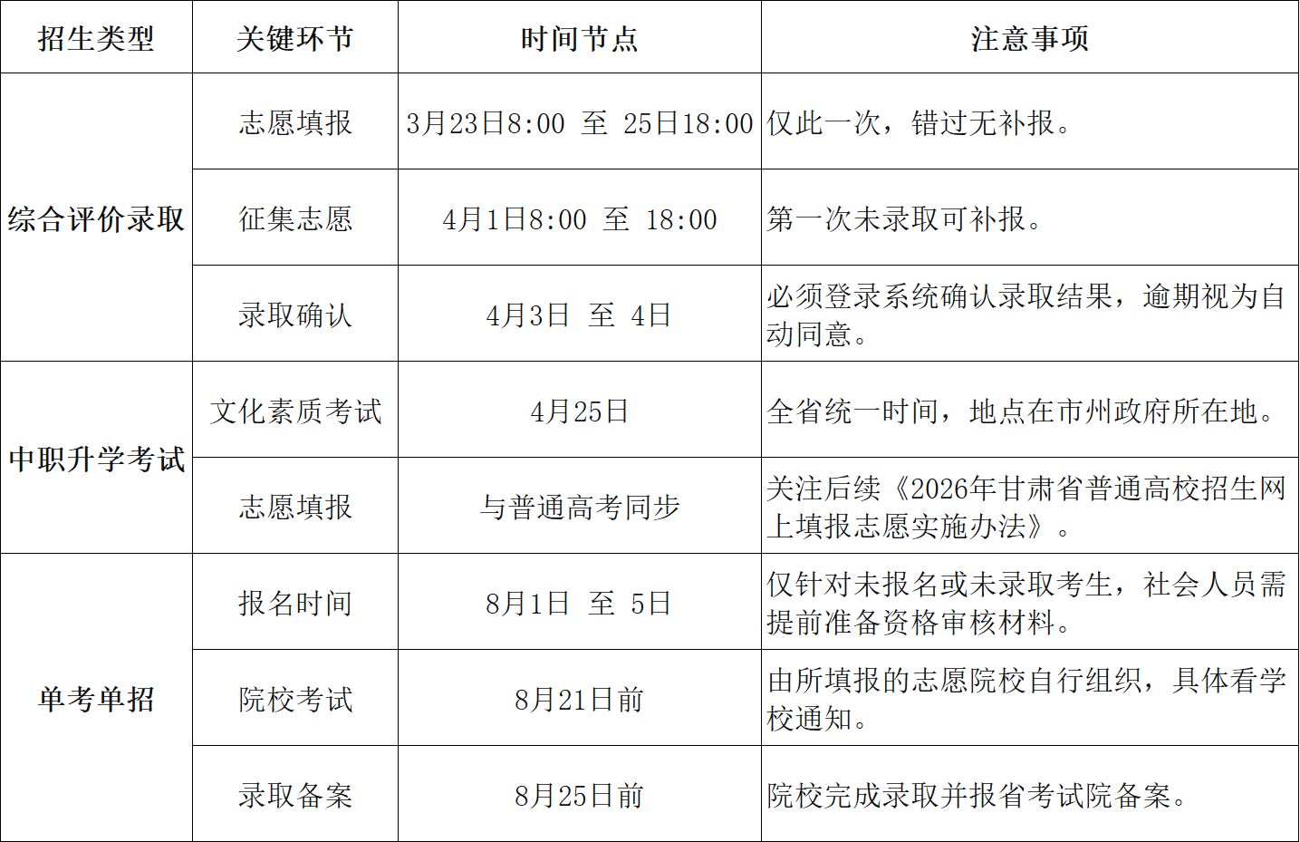 根據(jù)您提供的《關(guān)于做好2026年甘肅省高等職業(yè)教育分類考試招生工作的通知》及附件,我為您整理了考生和家長最關(guān)心的核心要點,以清晰明了的方式呈現(xiàn)如下: