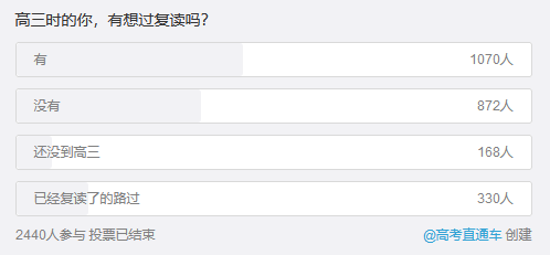 微博@高考直通車發(fā)起了相關(guān)投票,高三時(shí)想過復(fù)讀的學(xué)生占比超過了四成。