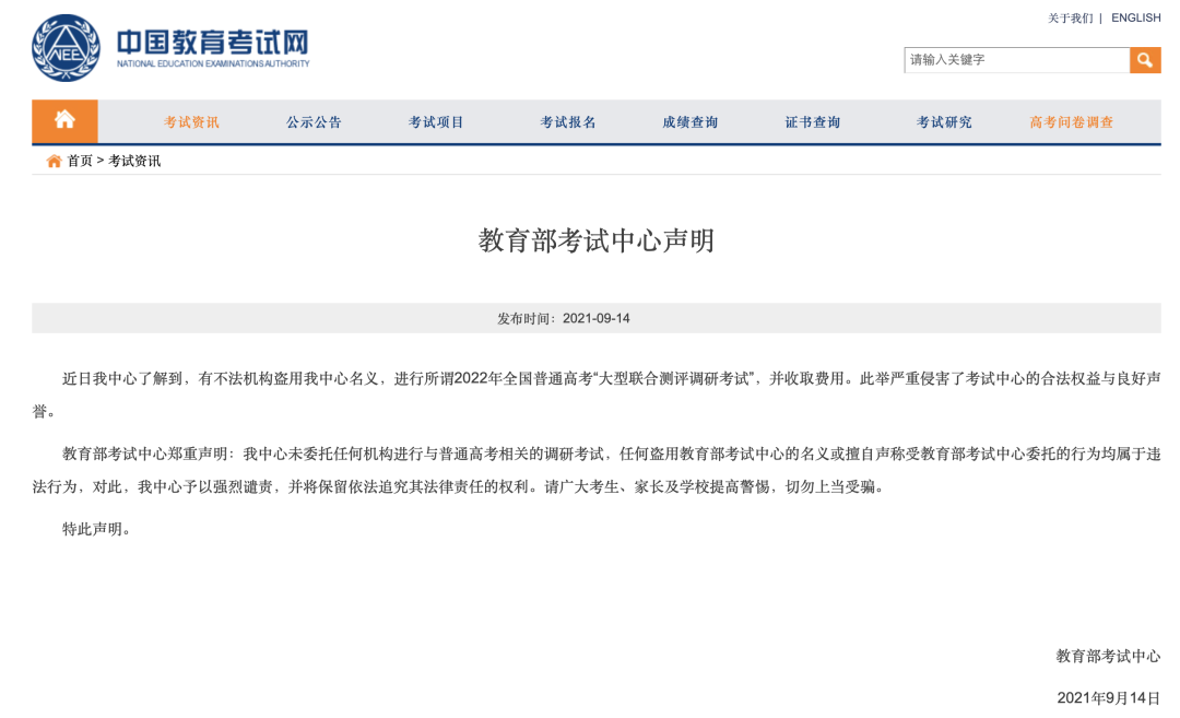 9月14日,教育部考試中心通過中國教育考試網(wǎng)發(fā)布聲明稱,近日有不法機構(gòu)盜用教育部考試中心名義,進行所謂2022年全國普通高考“大型聯(lián)合測評調(diào)研考試”,并收取費用。此舉嚴重侵害了考試中心的合法權(quán)益與良好聲譽。