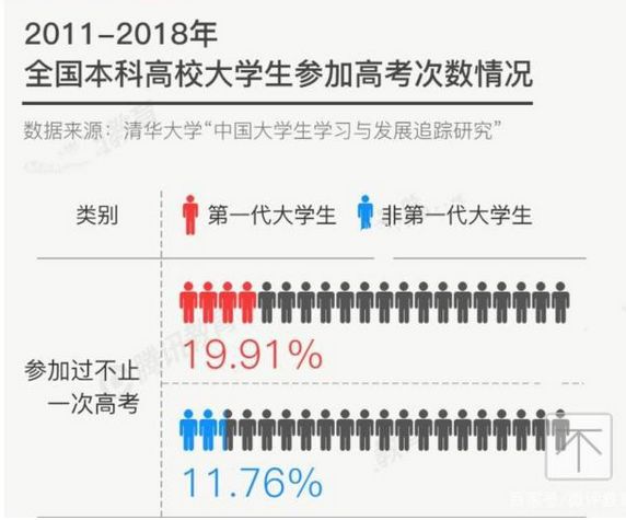 2011-2018年,全國本科大學(xué)里第一代大學(xué)生(即特指父母沒有讀過大學(xué)、通過自己的不懈努力進(jìn)入大學(xué)的學(xué)生)一直保持70%以上的占比。同時(shí),與非第一代大學(xué)生相比,更多的第一代大學(xué)生參加過多次高考(即復(fù)讀),占比達(dá)到19.91%。