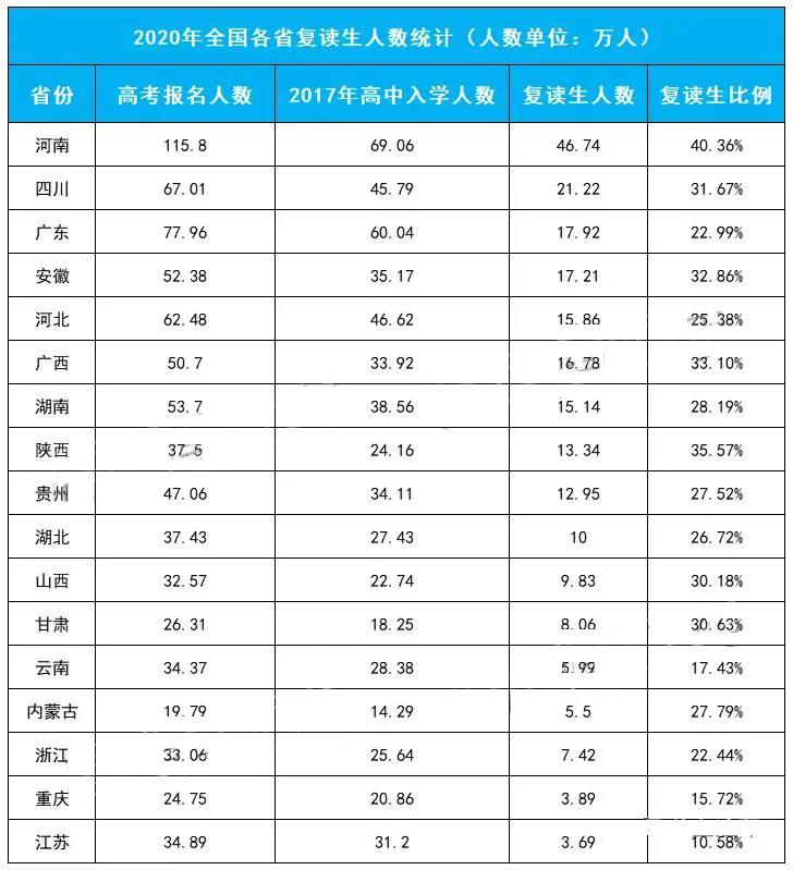 四川復(fù)讀人數(shù)達(dá)到了21.22萬,廣東、安徽、河北、廣西、湖南、陜西、貴州、湖北等8省復(fù)讀人數(shù)也都超過了10萬。