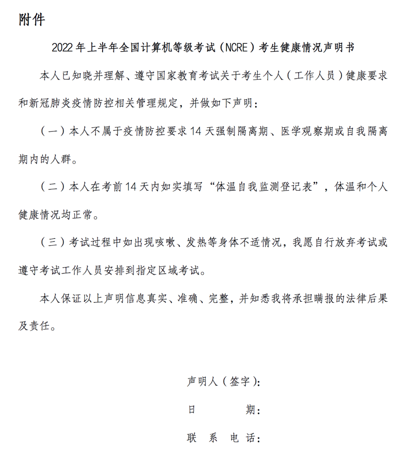 《2022年上半年全國計算機等級考試(NCRE)考生健康情況聲明書》