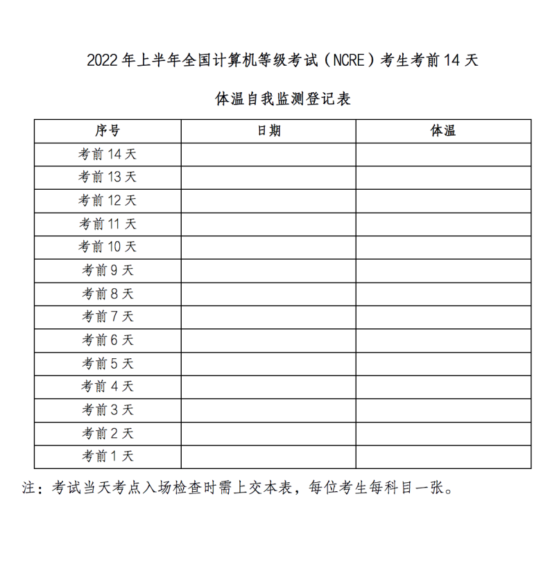 《2022年上半年全國計算機等級考試(NCRE)考生考前14天體溫自我監(jiān)測登記表》