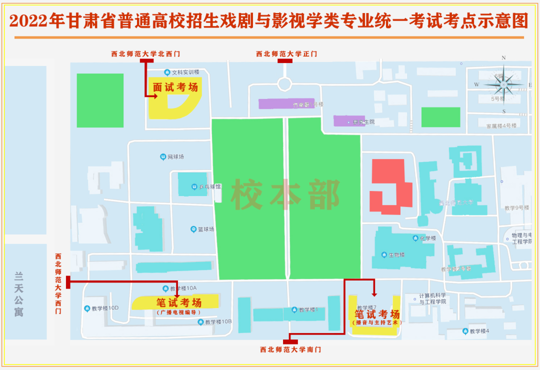 為做好新冠疫情防控工作,確??忌樌雸觯忌毎凑找?guī)定的出入口及路線出入相應(yīng)考點。考生應(yīng)提前在考點門口排隊,預(yù)留足夠時間配合考點工作人員進(jìn)行入場核驗。具體路線見《2022年甘肅省普通高校招生戲劇與與影視學(xué)類專業(yè)統(tǒng)一考試考點示意圖》。