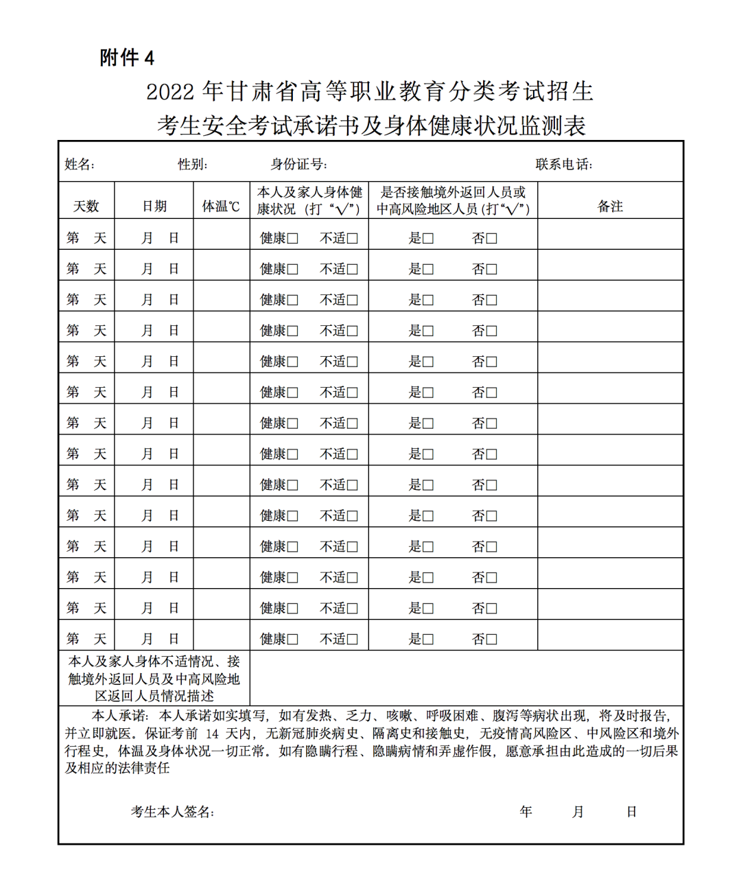 4.2022年甘肅省高等職業(yè)教育分類考試招生考生安全考試承諾書及身體健康狀況監(jiān)測表