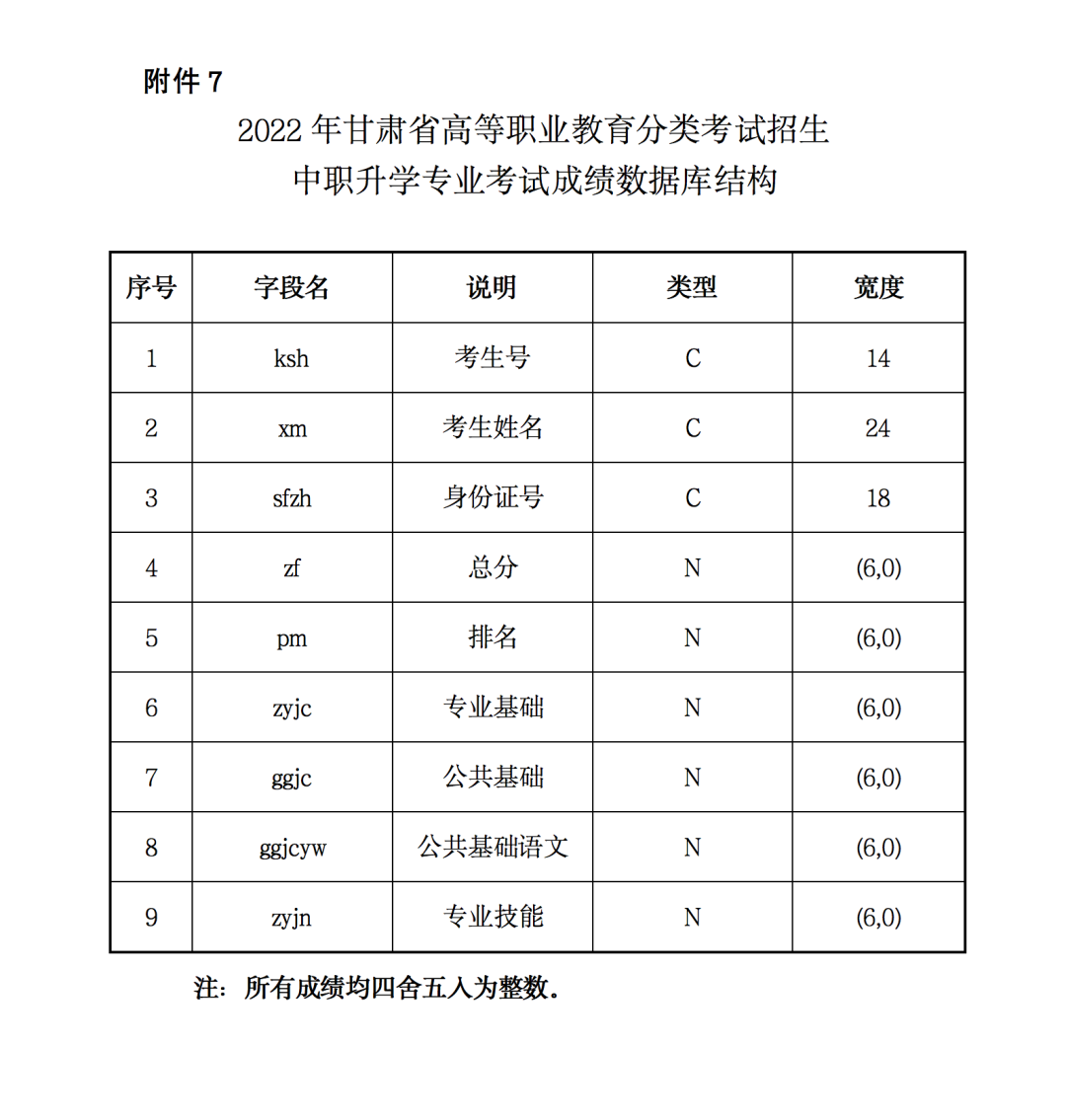 7.2022年甘肅省高等職業(yè)教育分類考試招生中職升學(xué)考試成績數(shù)據(jù)庫結(jié)構(gòu)