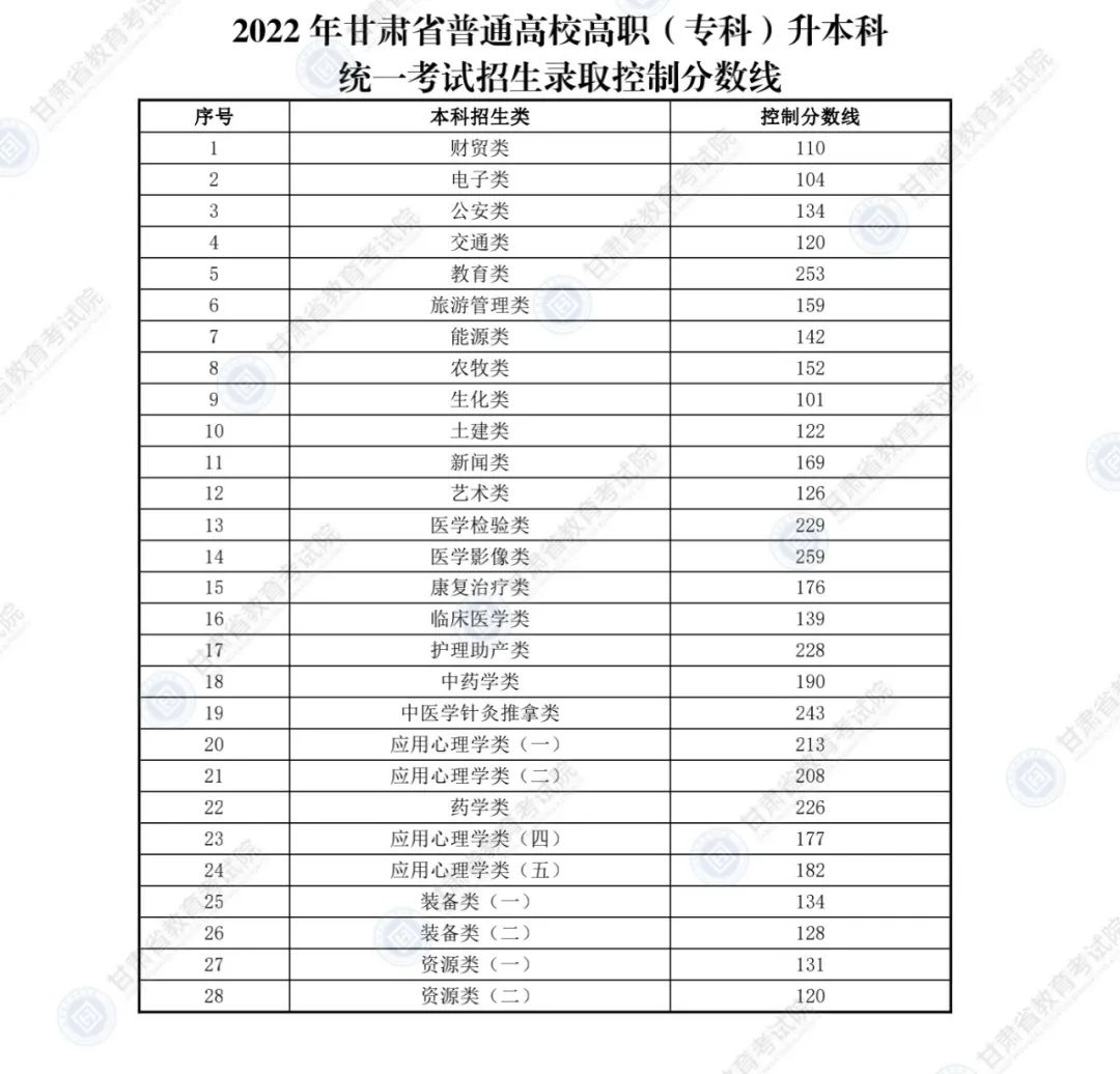 2022年甘肅省普通專(zhuān)升本考試招生錄取控制分?jǐn)?shù)線公布