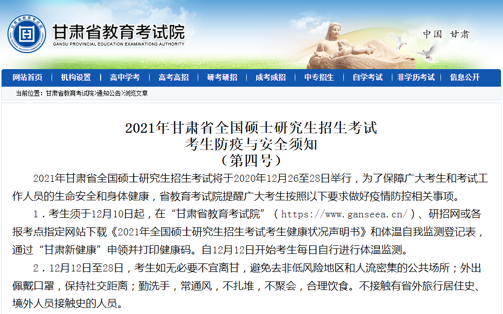 12月12日至28日,考生如無必要不宜離甘,避免去非低風險地區(qū)和人流密集的公共場所;外出佩戴口罩,保持社交距離;勤洗手,常通風,不扎堆,不聚會,合理飲食。不接觸有省外旅行居住史、境外人員接觸史的人員??忌鷳{準考證、有效身份證件、健康碼進入考點。首場考試進入考場時,向監(jiān)考人員提交《甘肅省2021年全國碩士研究生招生考試考生健康狀況聲明書》(本人簽字)和體溫自我監(jiān)測登記表??忌M入考點時須聽從考試工作人員指揮,配合考點完成健康碼和體溫測量等健康檢查。體溫達到或超過37.3℃的考生須經(jīng)現(xiàn)場醫(yī)療衛(wèi)生專業(yè)人員復查體溫及綜合評估,確定考生符合健康應試要求后,方可進入考點。