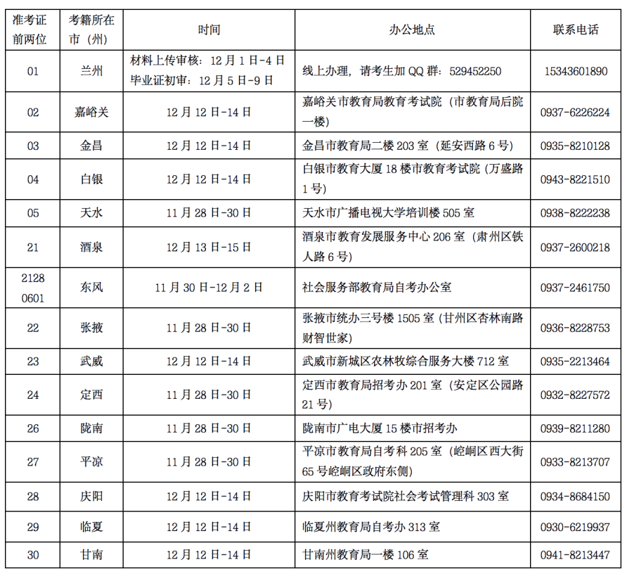 2022年下半年甘肅省高等教育自學(xué)考試社會型考生各市州畢業(yè)初審時間及聯(lián)系方式