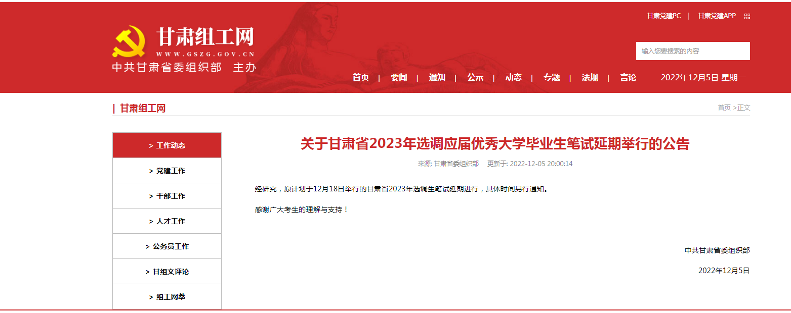 經研究,原計劃于12月18日舉行的甘肅省2023年選調生筆試延期進行,具體時間另行通知。