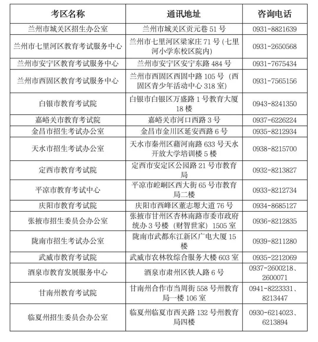 請考生提前做好備考工作,密切關注甘肅省教育考試院官方網(wǎng)站、官方微信公眾號,及時了解相關考試信息,如有疑問可咨詢報考所在地教育考試招生機構(詳見附件)。
