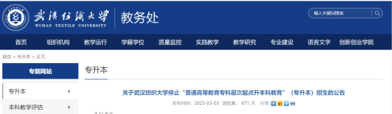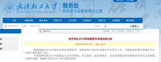 近日,部分高校發(fā)布停止專(zhuān)升本招生工作:武漢紡織大學(xué)于3日發(fā)布公告,經(jīng)學(xué)校研究決定,報(bào)湖北省教育廳同意,該校自2023年起停止開(kāi)展“普通高等教育專(zhuān)科層次起點(diǎn)升本科教育”(專(zhuān)升本)招生工作。同日,武漢輕工大學(xué)《關(guān)于停止2023年普通專(zhuān)升本招生的公告》明確,停止2023年普通專(zhuān)升本招生工作。