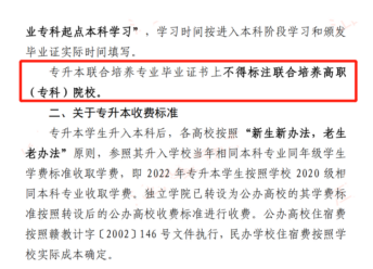 不少地區(qū)的聯(lián)合培養(yǎng)在招生對(duì)象、考試內(nèi)容、錄取原則、學(xué)籍學(xué)歷等方面,與我們了解的專(zhuān)升本并無(wú)區(qū)別,最終都是由本科高校頒發(fā)普通高等教育本科畢業(yè)證書(shū),并授予學(xué)士學(xué)位。江西省教育廳發(fā)布的《關(guān)于規(guī)范普通高校專(zhuān)升本學(xué)生教育管理工作的通知》也明確,專(zhuān)升本聯(lián)合培養(yǎng)專(zhuān)業(yè)畢業(yè)證書(shū)不得標(biāo)注聯(lián)合培養(yǎng)高職(專(zhuān)科)院校。