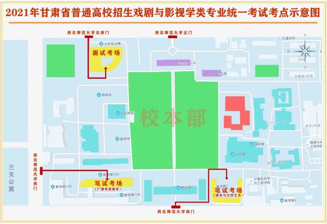 為做好新冠疫情疫情防控工作,確??忌樌雸?,考生須按照規(guī)定的出入口及路線出入相應(yīng)考點(diǎn)??忌鷳?yīng)提前在考點(diǎn)門口排隊(duì),預(yù)留足夠時(shí)間配合考點(diǎn)工作人員進(jìn)行入場核驗(yàn)。具體路線見《2021年甘肅省普通高校招生戲劇與與影視學(xué)類專業(yè)統(tǒng)一考試考點(diǎn)示意圖》。