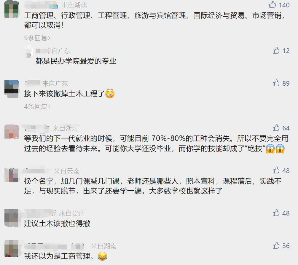 4月12日晚,話題#90所大學(xué)撤銷公共事業(yè)管理專業(yè)#登上微博熱搜。據(jù)媒體報(bào)道,在2015到2021年這7年時(shí)間里,共有90所大學(xué)撤銷了公共事業(yè)管理專業(yè),引發(fā)關(guān)注。而在評(píng)論區(qū),不少網(wǎng)友提出了他們認(rèn)為可能被撤銷的專業(yè):